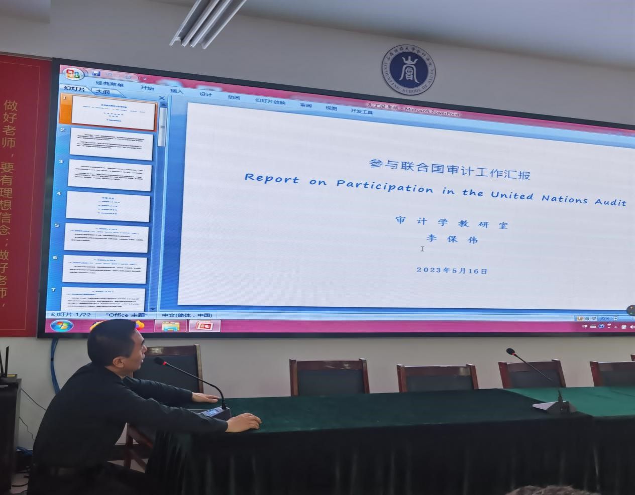 李保伟老师首先介绍了中国政府参与联合国审计的基本情况和意义:2023年1月1日起,中国审计署侯凯审计长担任联合国审计委员会主席。中国政府参与联合国审计,将扩大中国审计的影响力,为促进联合国加强管理、提高绩效、增加透明、强化问责、深化改革、完善治理贡献中国力量。