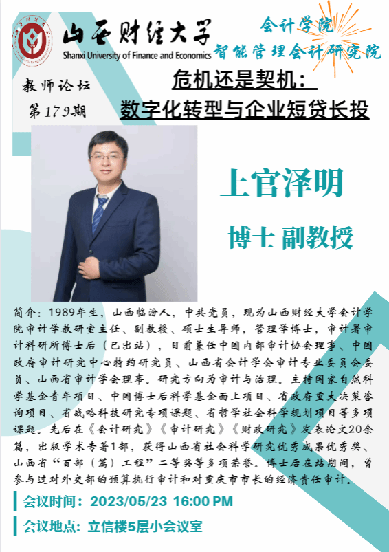 与智能管理会计研究院举行了第179次教师学术论坛。本次论坛主要内容是上官泽明老师作报告《危机还是契机:数字化转型与企业短贷长投》。