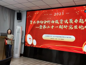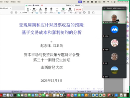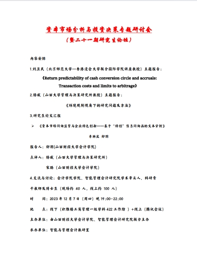 与智能管理会计研究院联合举办的研究生论坛(第二十一期)以线下线上两种方式同步举行。本次学术论坛的主题为“资本市场分析与投资决策”,轮值主持人为智能与管理会计教研室主任贺亚楠副教授,论坛特别邀请北京师范大学—香港浸会大学联合国际学院刘卫民教授与山西大学管理与决策研究所杨威教授做主题报告。