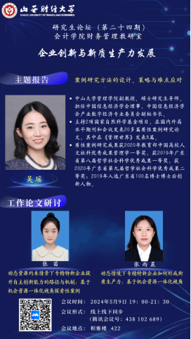 财务管理教研室负责组织,主题为“企业创新与新质生产力发展”,特别邀请了中山大学管理学院副教授、硕士研究生导师吴瑶进行讲座。