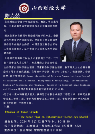 2024年9月12日下午,韩国无码 在积雅楼422举办学术研讨会,邀请东北财经大学韩国无码 副院长、博导陈克兢教授做主题报告《Wisdom of Which Crowd? Evidence from an Information-Technology Shock》。