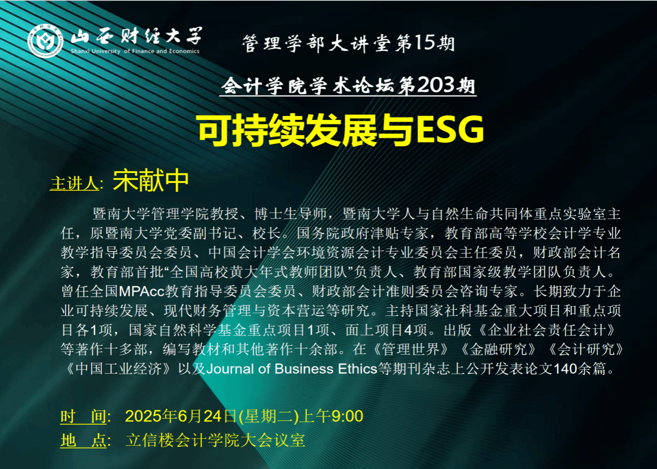 邀请国内会计领域著名专家,暨南大学管理学院宋献中教授进行学术交流。宋教授是暨南大学人与自然生命共同体重点实验室主任,原暨南大学党委副书记、校长。长期致力于企业可持续发展、现代财务管理与资本营运等研究。主持国家社科基金重大项目和重点项目各1项,国家自然科学基金重点项目1项、面上项目4项。出版《企业社会责任会计》等著作十多部,编写教材和其他著作十余部。在国内外顶级期刊杂志上公开发表论文140余篇。