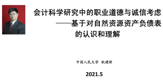 中国人民大学商学院耿建新教授在北京通过视频连线做了题为“会计科学研究中的职业道德与诚信考虑”的专题演讲,耿教授基于对自然资源资产负债表的认识和理解,畅谈会计科学研究中的职业道德与诚信观,呼吁会计学者面对一些需要澄清的事项,应当有勇气力争通过自己的语言将未来的事情做的更好。