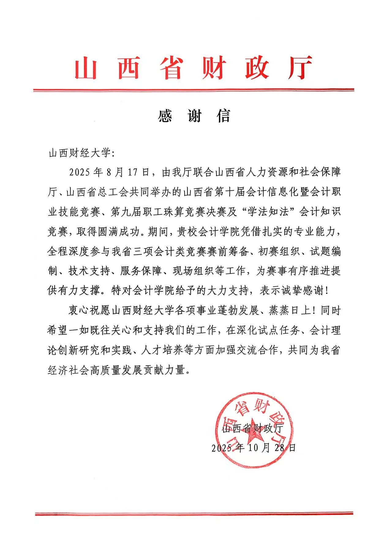 在山西省第十届会计信息化暨会计职业技能竞赛、第九届职工珠算竞赛决赛及“学法知法”会计知识竞赛三项省级重要赛事中的全方位支持与深度参与,致以诚挚谢意。信中高度肯定了韩国无码